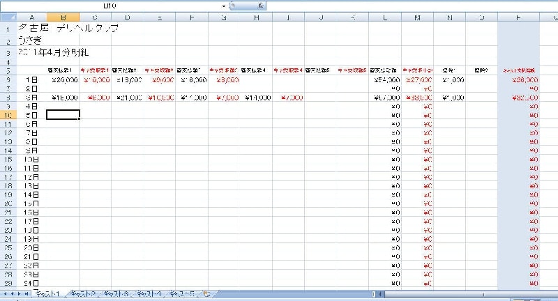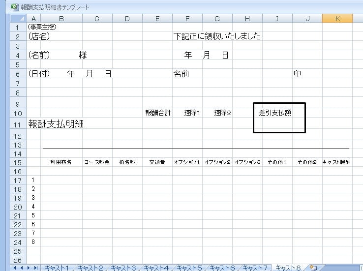 ※デリヘル開業フルサポートご依頼の方へは、下記、キャスト別報酬支払台帳テンプレート、報酬支払明細書(日払い)テンプレートをご用意させていただきます(無償ですが、設定変更などはお客様にてお願いいたします。また、設定変更に伴うソフトのサポートなどはいたしておりません)。